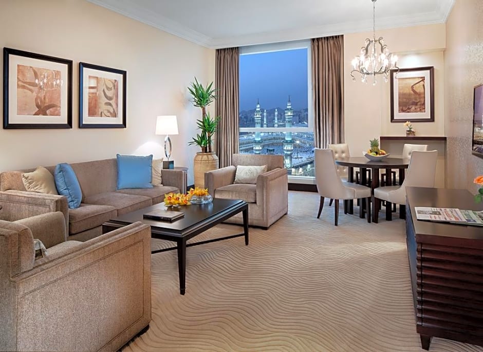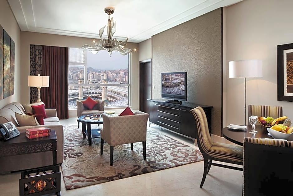 This suite overlooks the city of Makkah. It offers a controllable audio system that transmits Azan and prayers into your room, a television, a mini-bar, a seating area and air conditioning system. You can also enjoy free WiFi during your stay. Please note that the size and view of the room might slightly vary, depending on its floor.